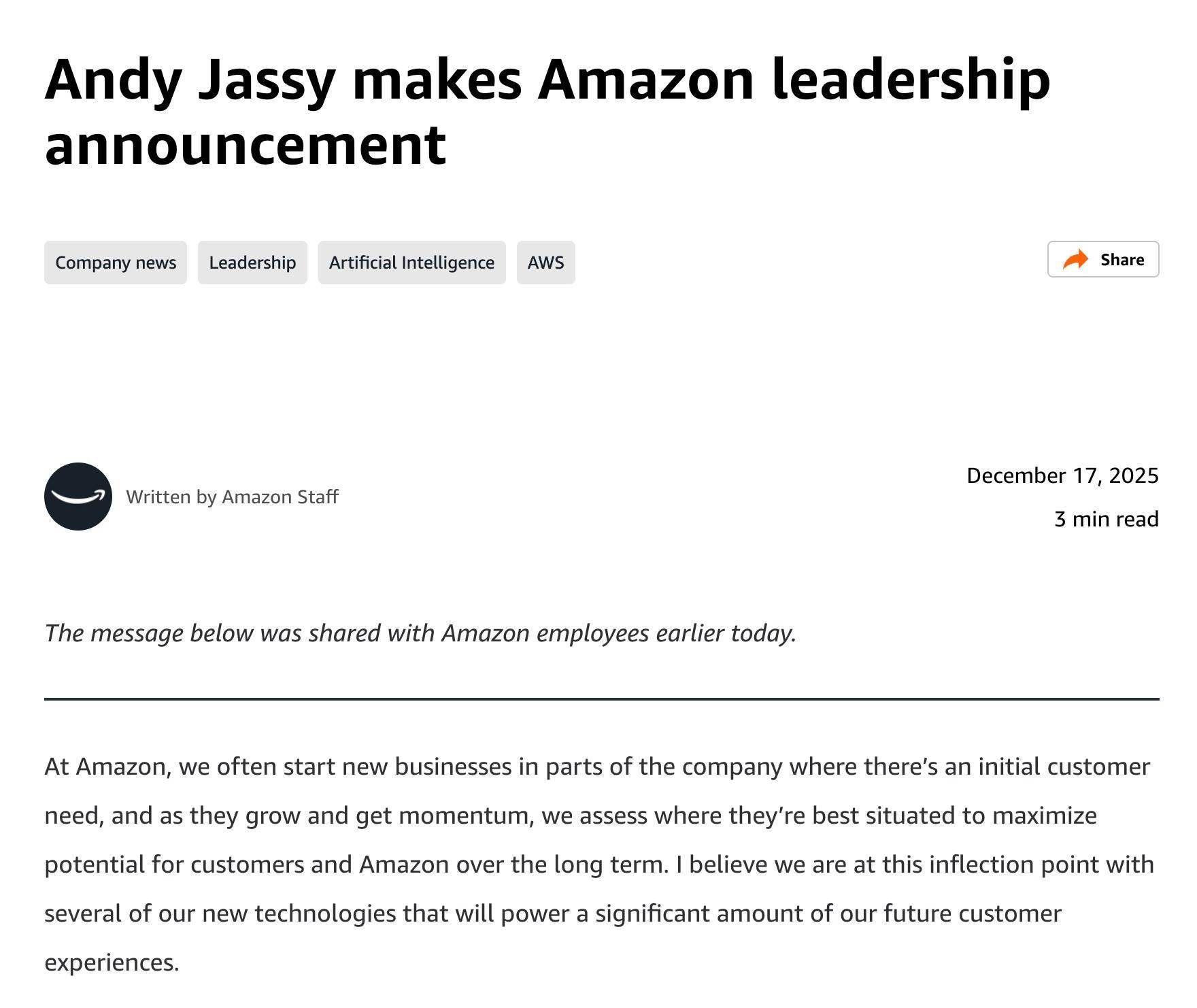 ▲亚马逊云科技关于重组AI部门的公告(来源:亚马逊)